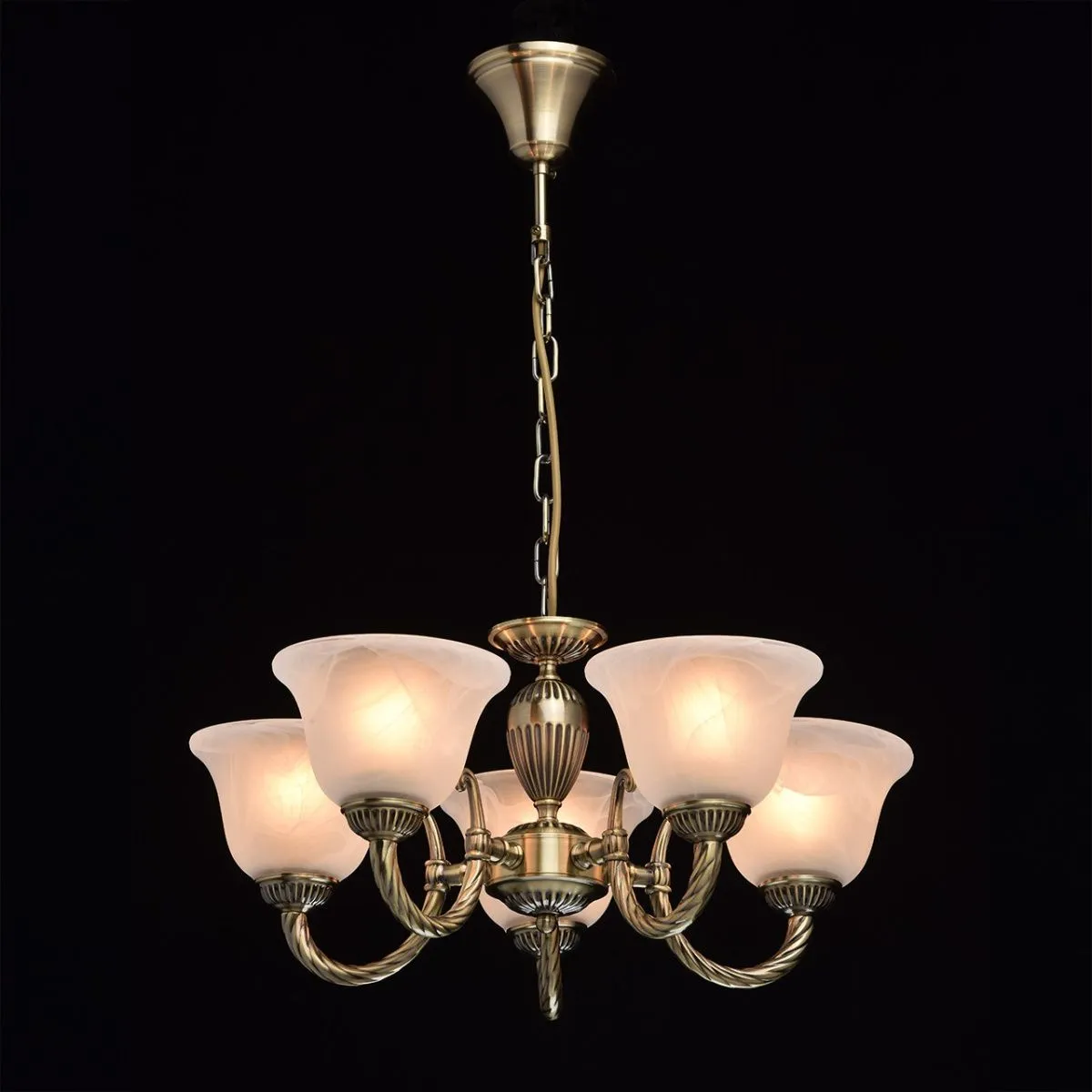 Металлическое основание цвета античной бронзы. Плафоны: матовый плафон из алебастрового стекла.