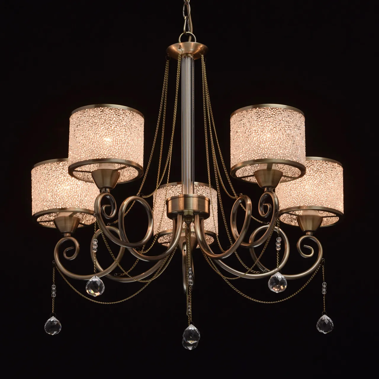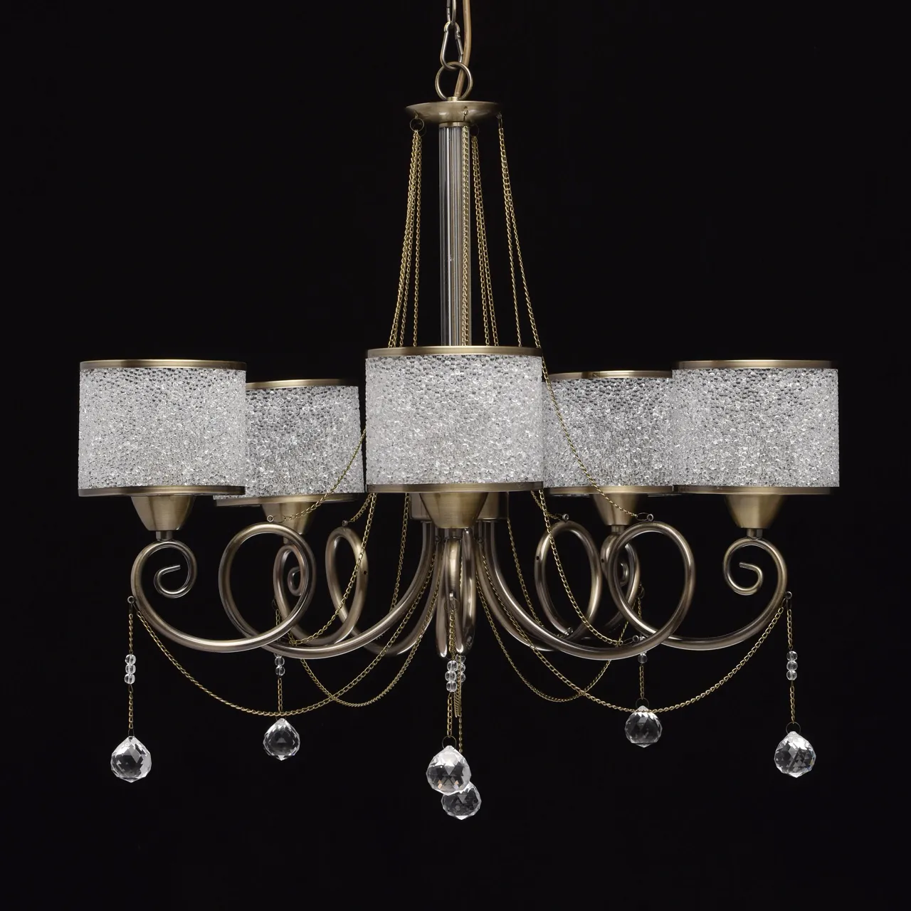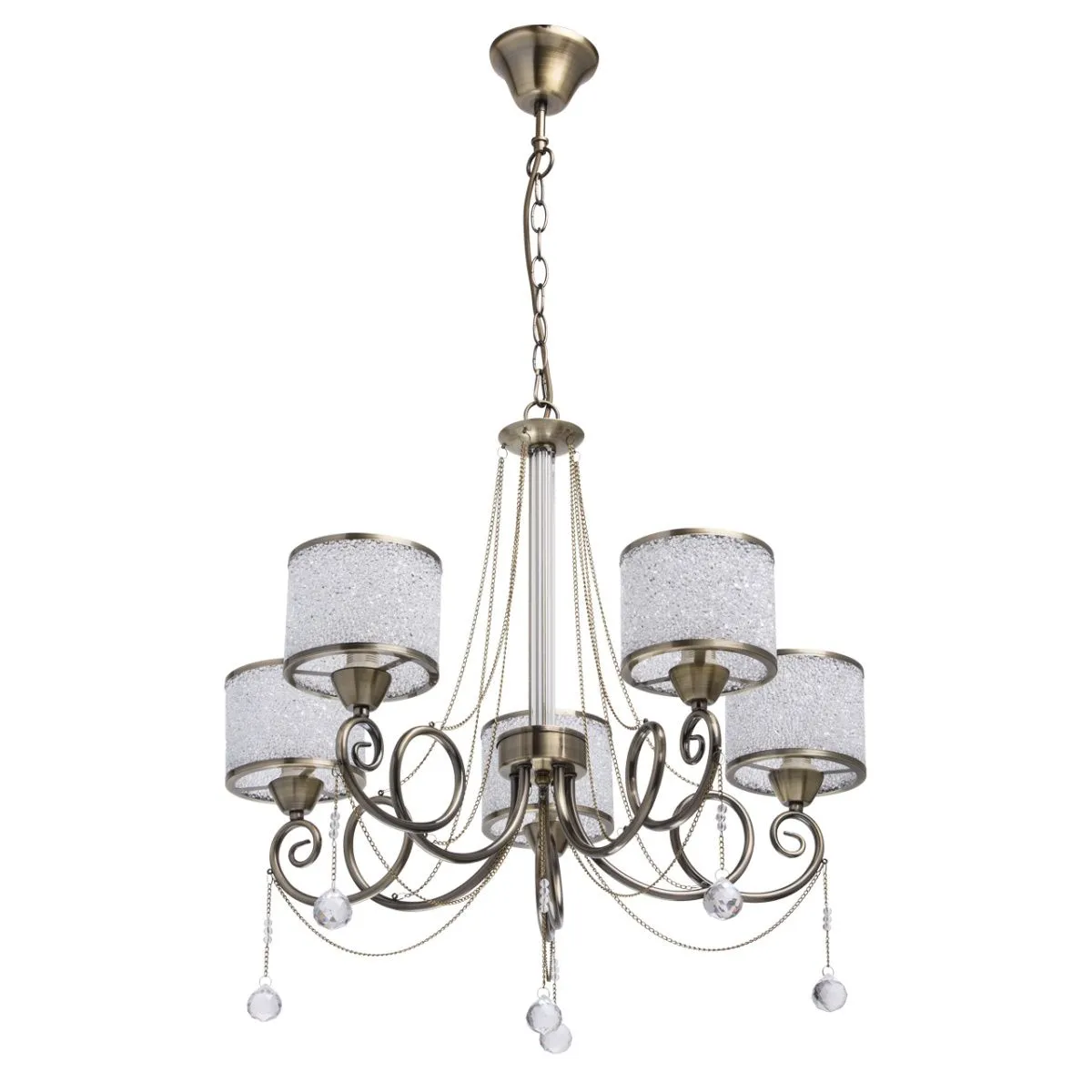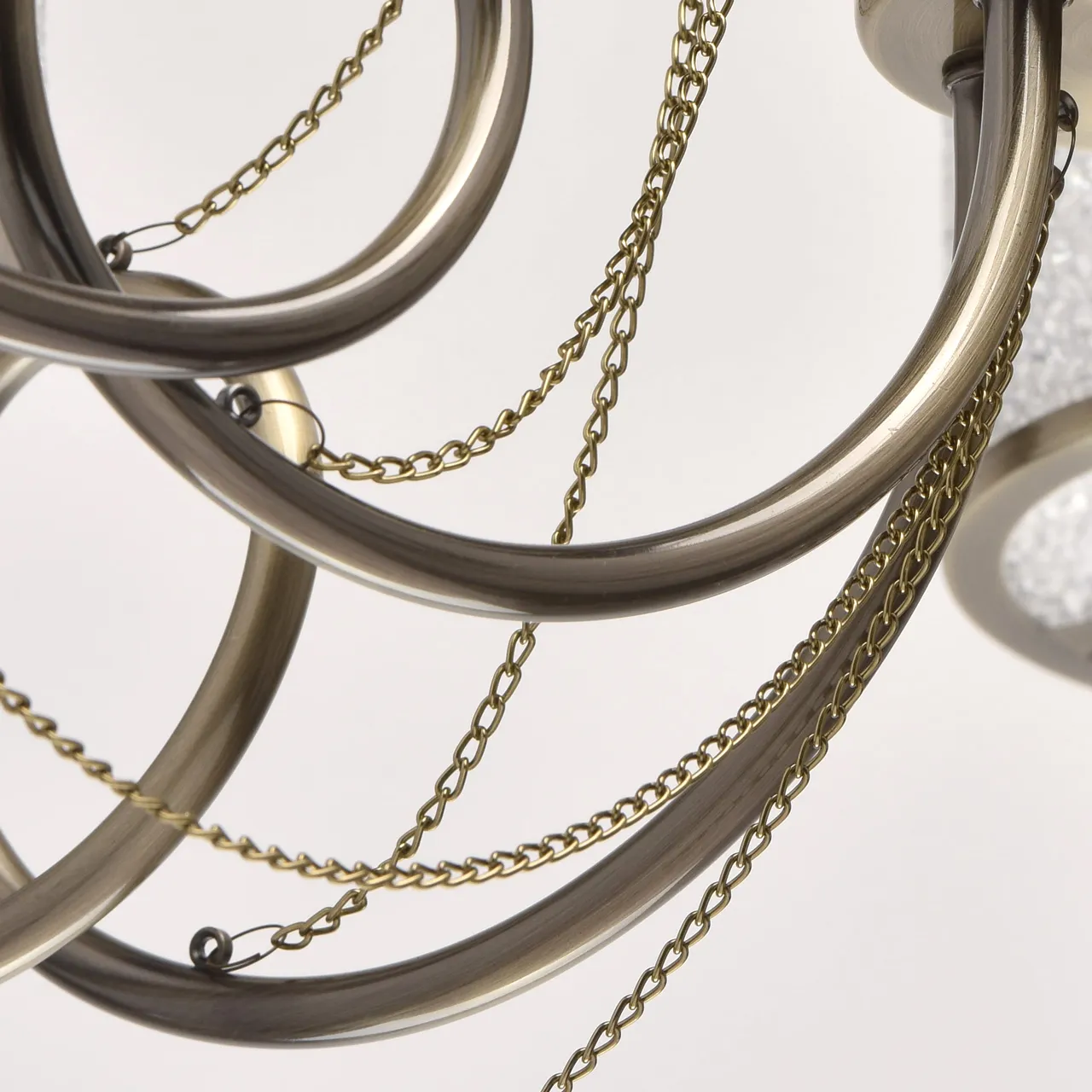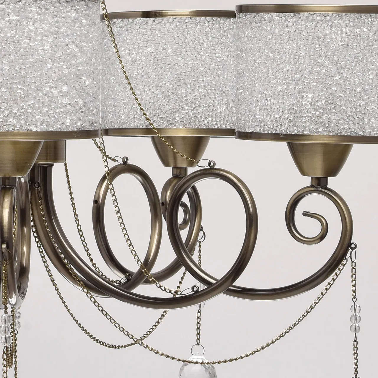 Металлическое основание цвета античной бронзы. Плафоны: акрил. Декор: металлические цепочки и подв