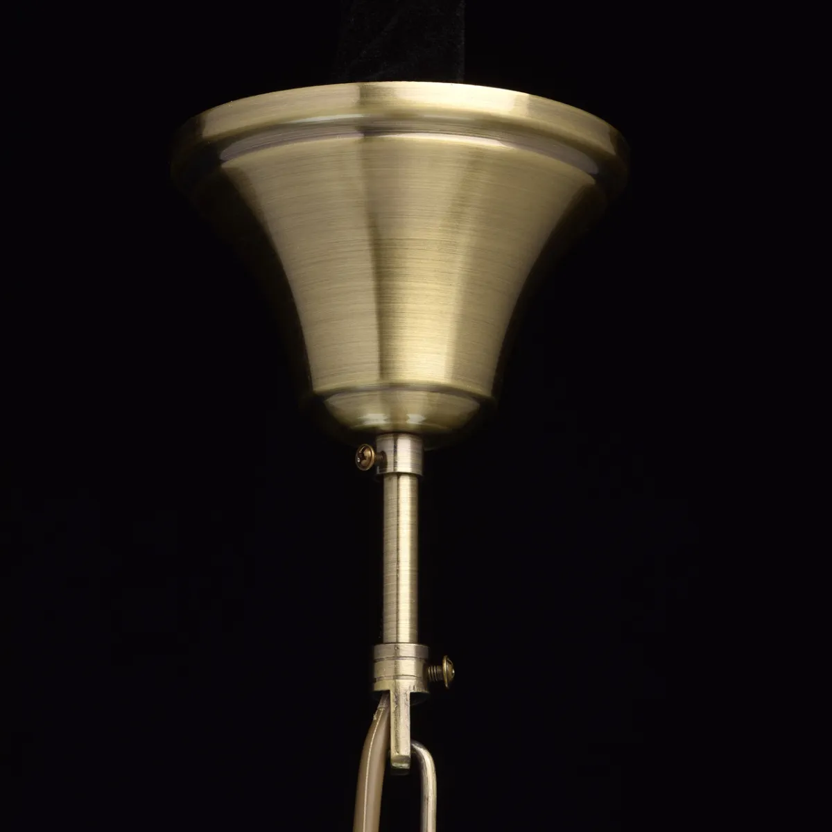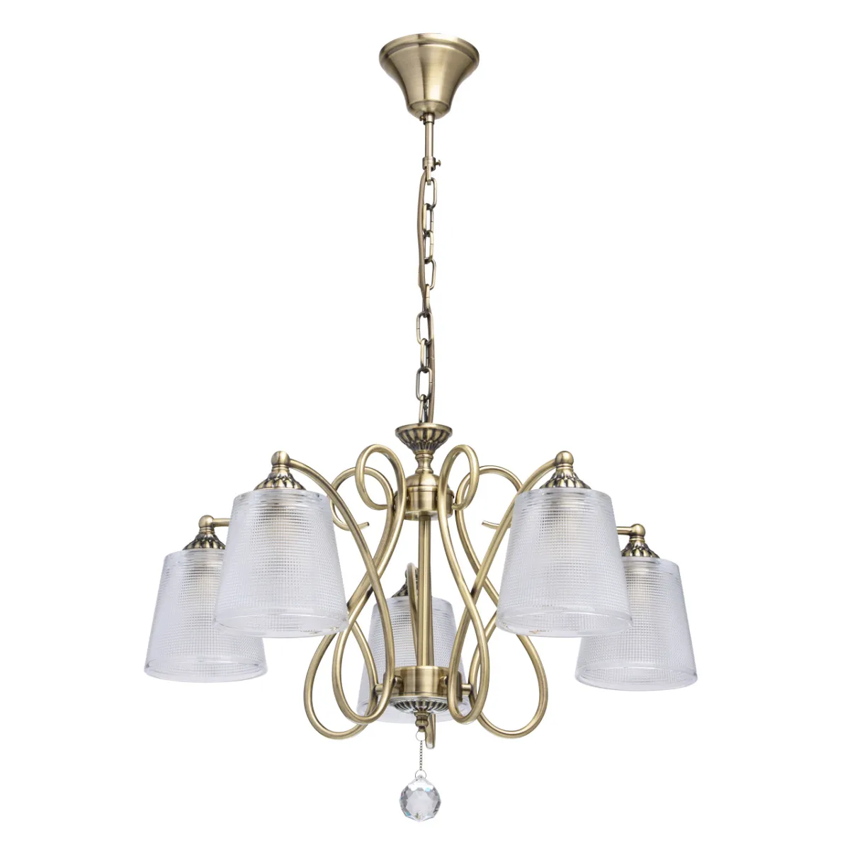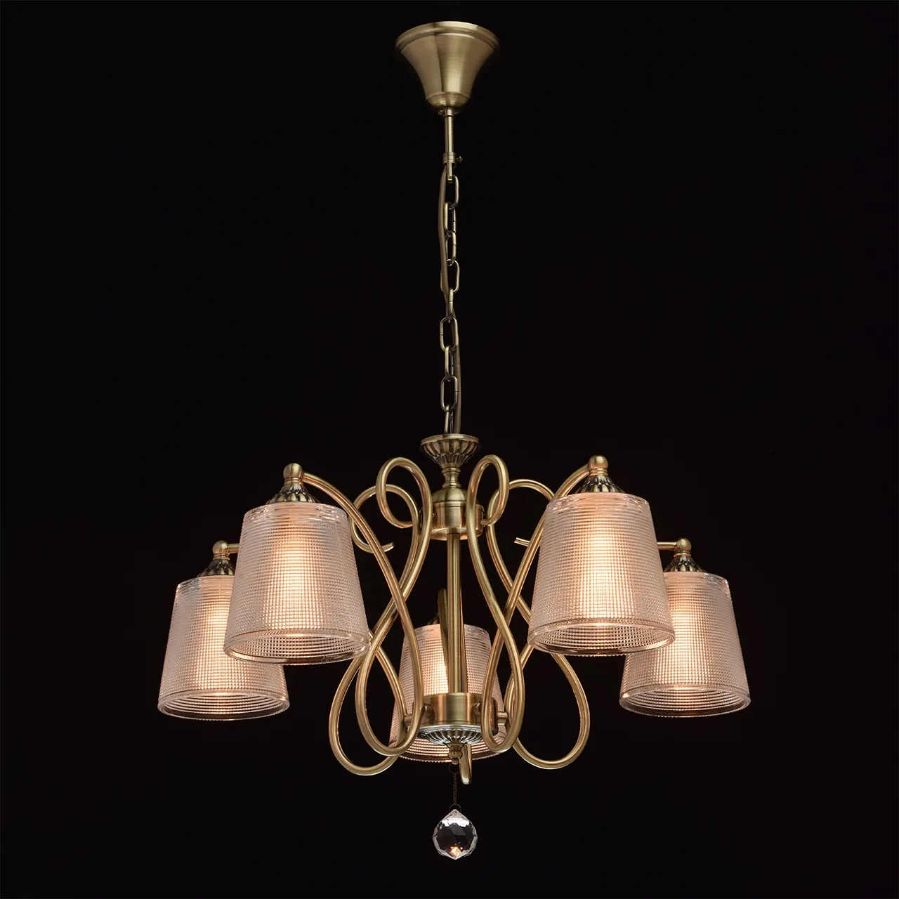 Металлическое основание цвета античной бронзы. Плафоны - стекло. Декор - хрусталь.