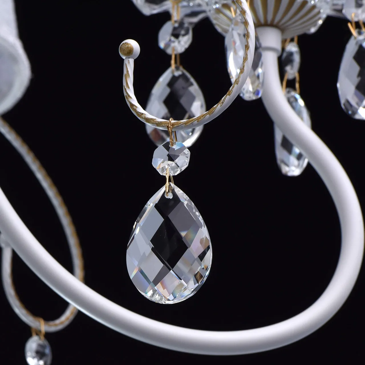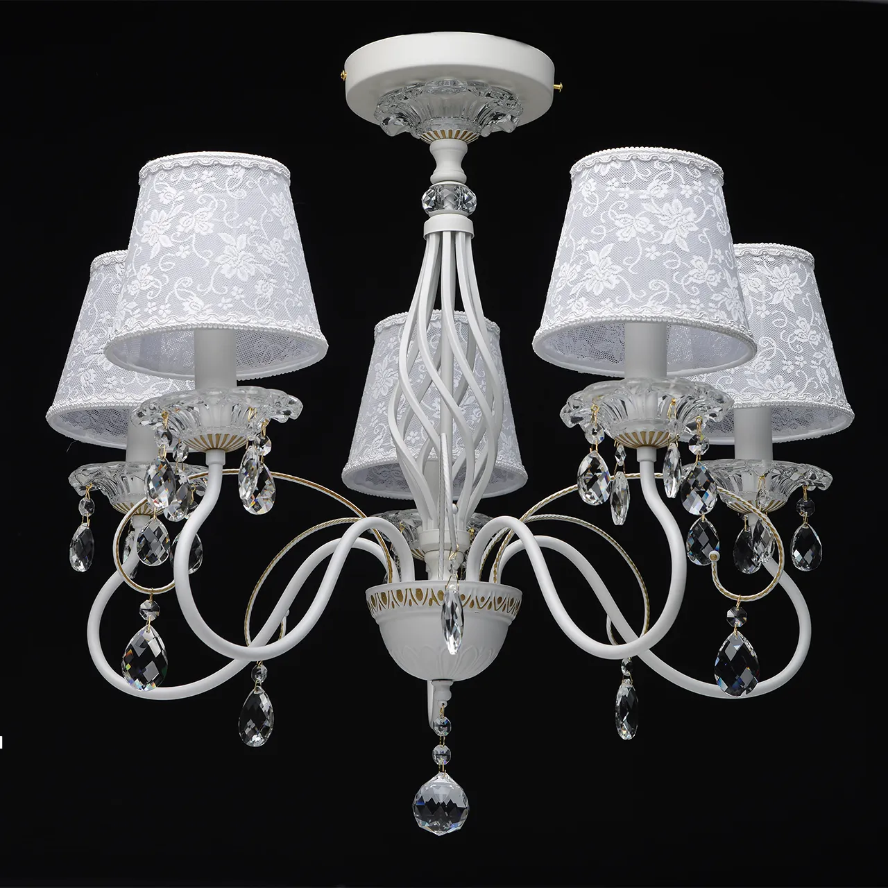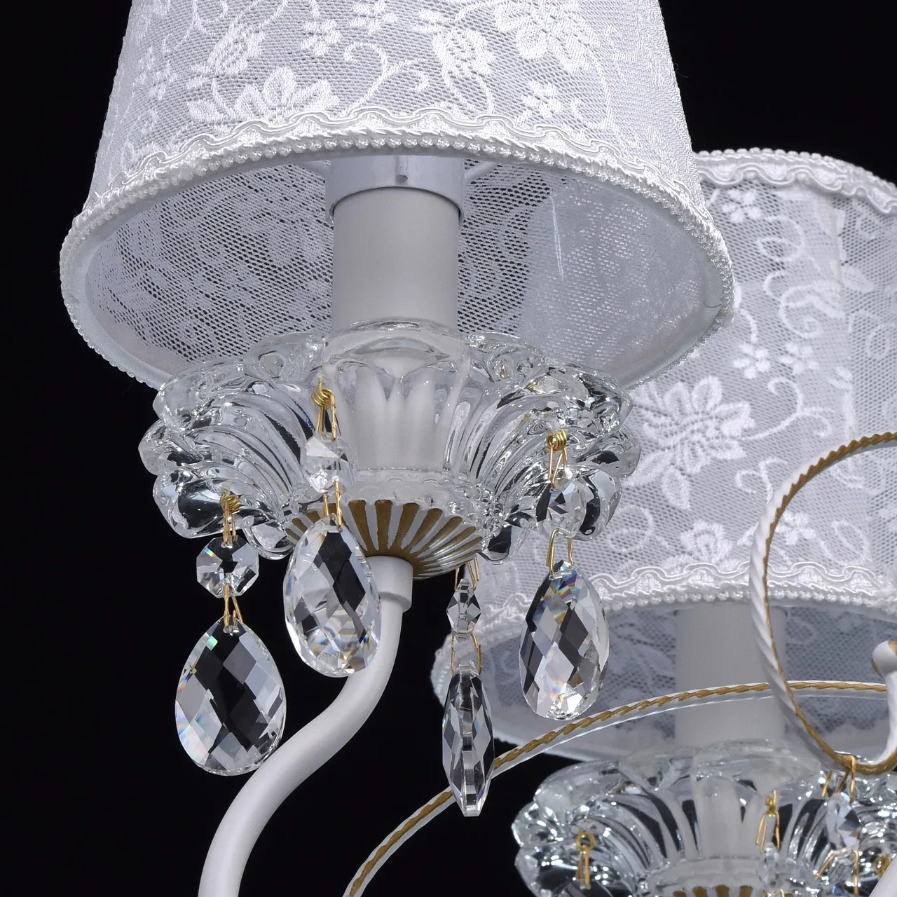 Металлическое основание белого цвета с золотистой патиной. Абажуры: из кружева. Декор: массив хрус