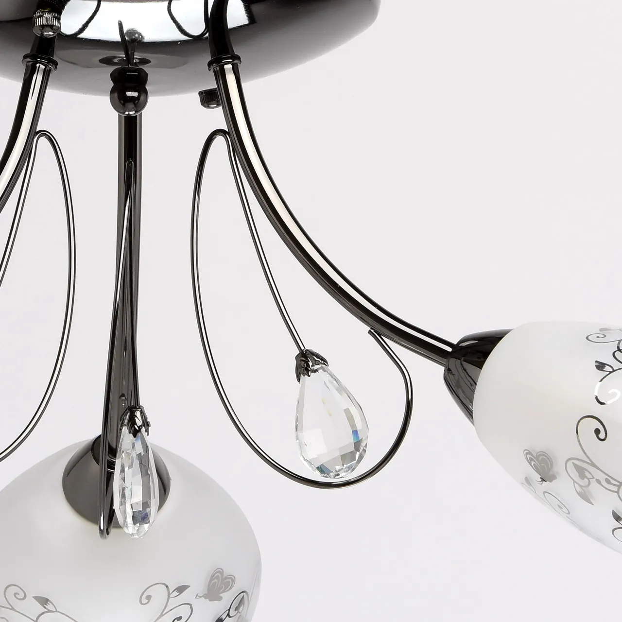 Металлическое основание цвета никеля, плафоны из матового стекла с гальванизированным рисунком, деко